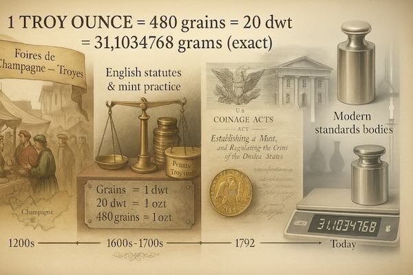 Why this matters: the Troy ounce is not an approximation—it’s a precisely defined SI-traceable unit through the grain/gram relationship, which is why it remains the legal/technical basis for bullion weights.
